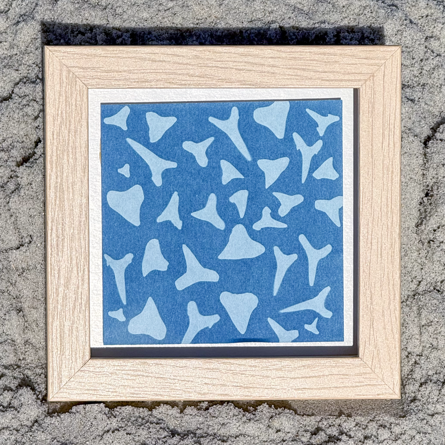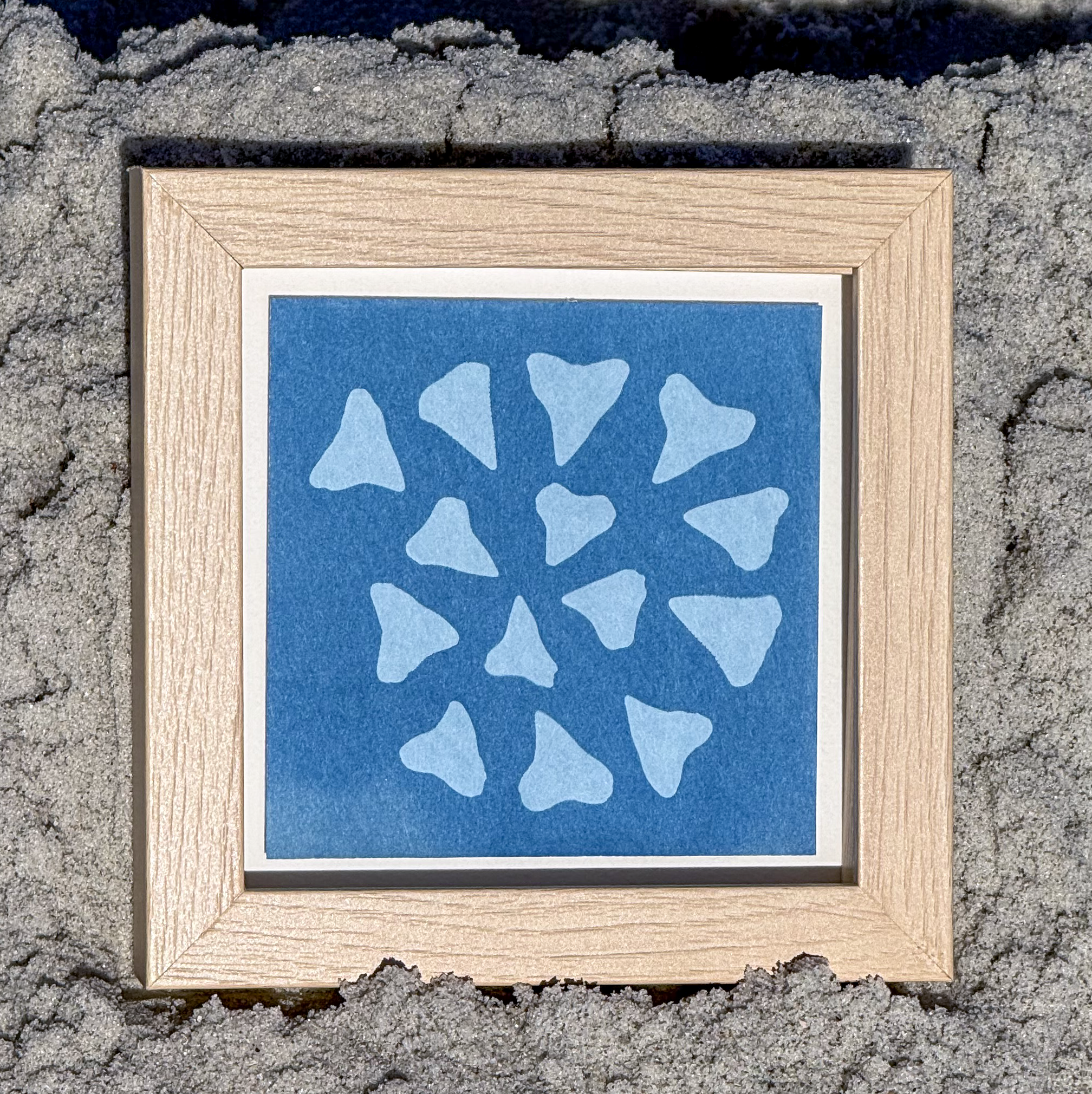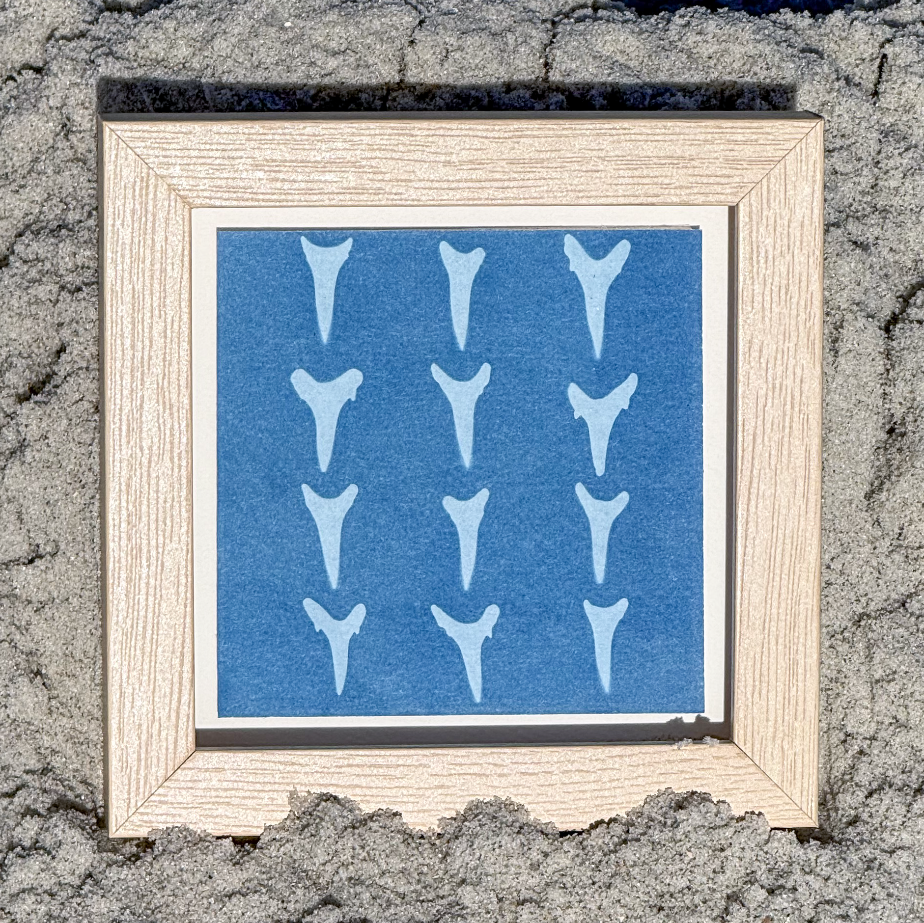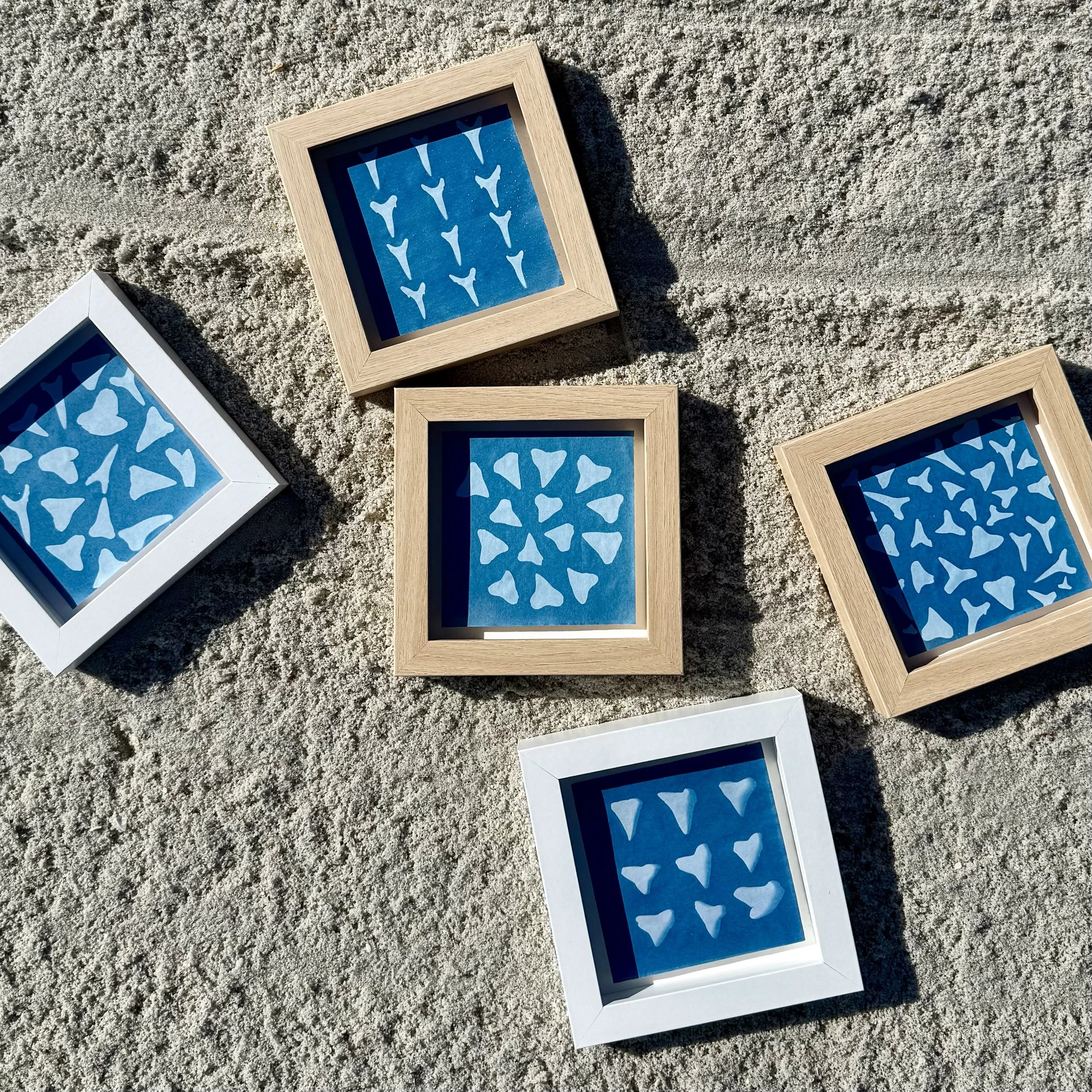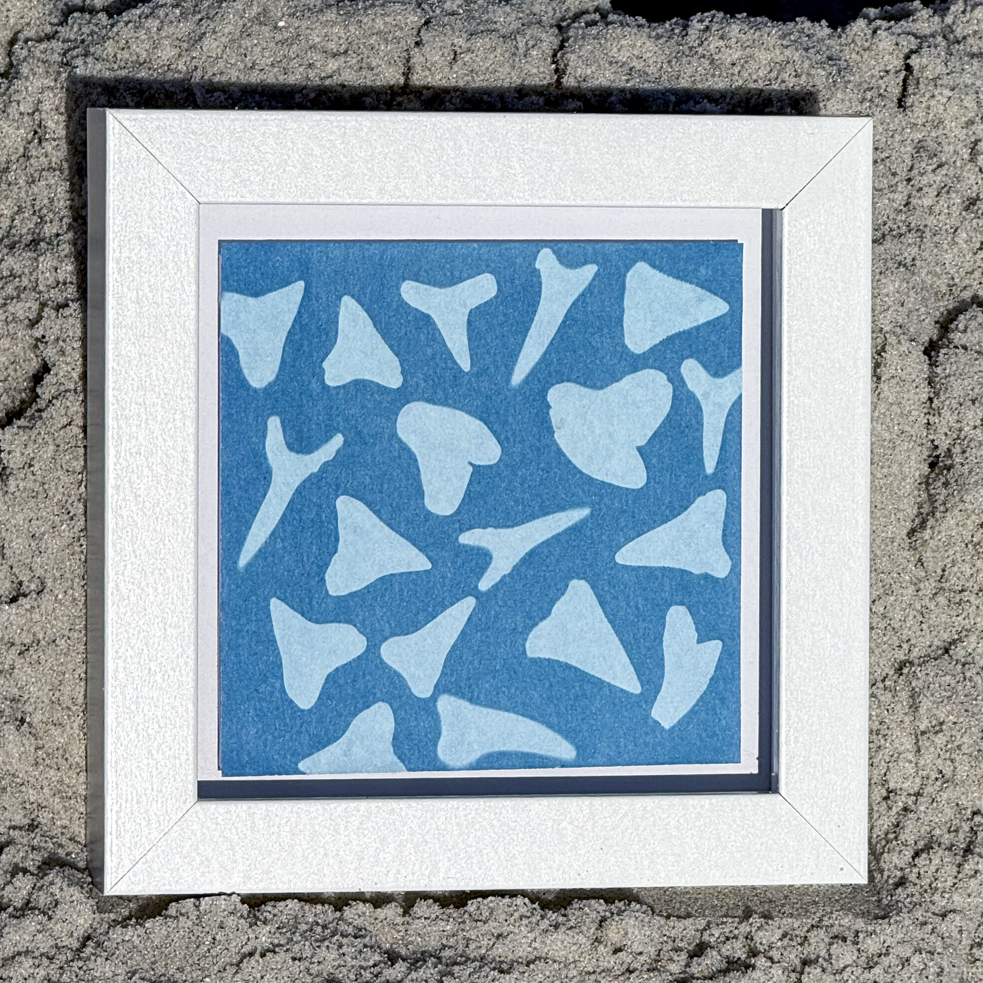 Cyanotype photograms made with shark teeth collected from the beaches of Ponte Vedra and St. Augustine. Each print is hand-coated and sun-exposed, creating a one-of-a-kind deep blue artwork.